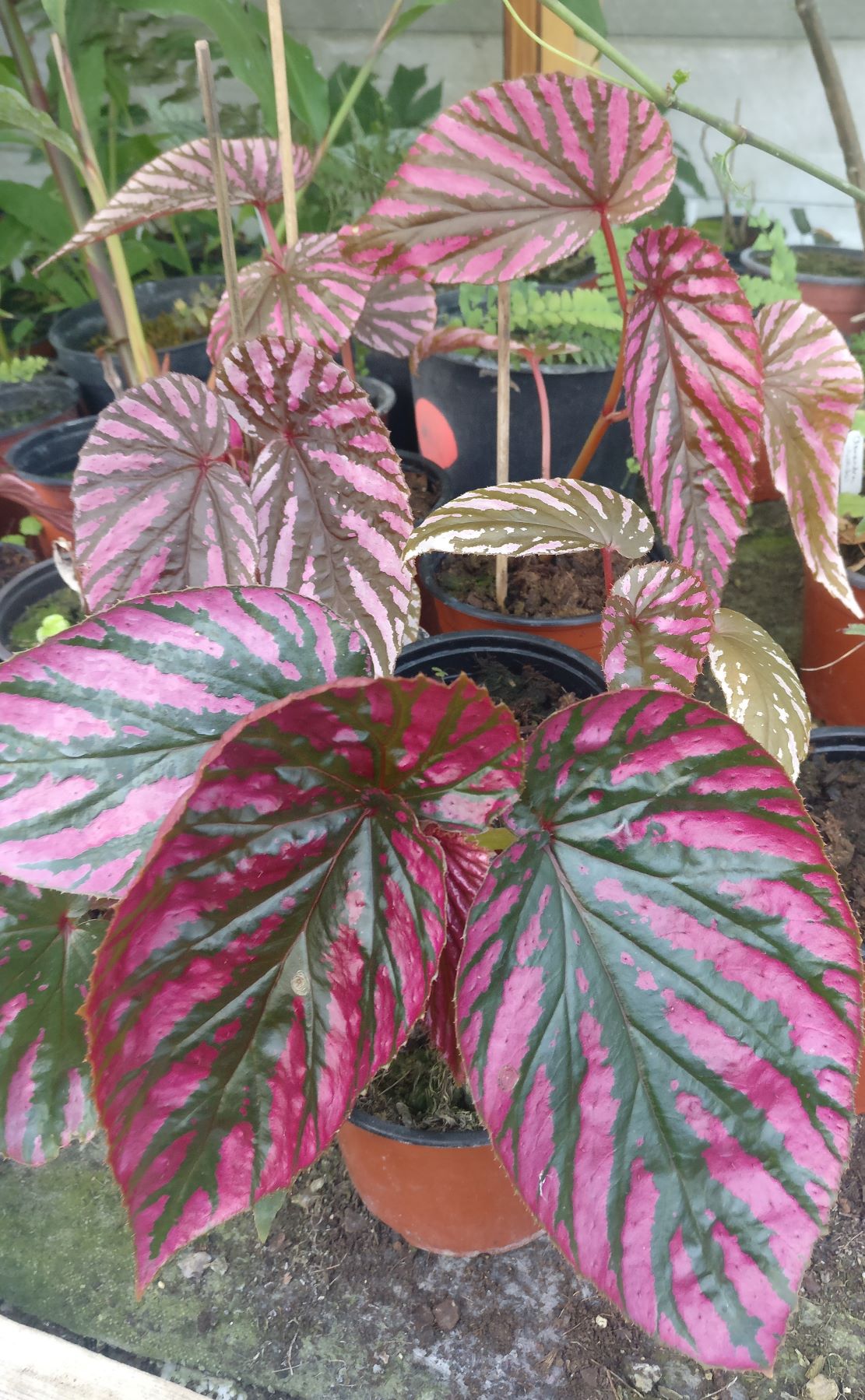 Et voici une beauté de Nouvelle Guinée. Ce Begonia bambusiforme fait de grandes feuilles (20 cm de long) au coloris formidablement attrayant, avec de larges macules rouge rosé ne laissant que peu de place au vert! Il apprécie la chaleur et l’humidité. Ses couleurs chatoyantes et son gabarit sont ses atouts principaux. Culture facile si cultivé en terrarium ou en intérieur chaud humide.