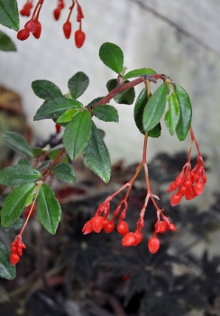 Ce Begonia bambusiforme très touffu ressemble vraiment à un Fuchsia de loin : les fleurs rouge vermillon apparaissent en grappes pendantes au bout des branches. Garder hors gel l’hiver et réduire les arrosages. En intérieur, croissance et floraison toute l’année.