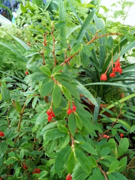 Begonia ‘Corbeille de Feu’ est plus coloré de rouge que B. fuchsioides : les pédoncules floraux sont rouges, alors qu’ils sont verts chez B. fuchsioides.