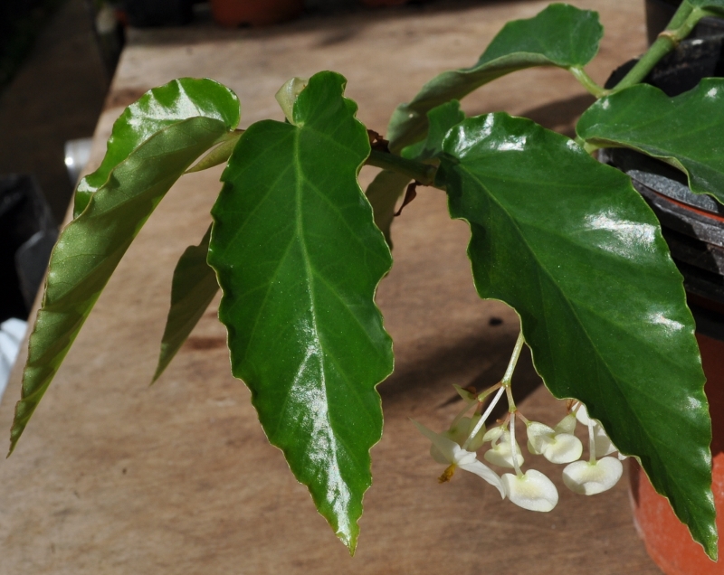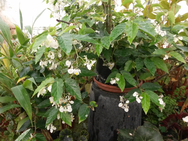 Nouveauté 2017. Ce Begonia bambusiforme monte à environ 60 cm en culture en intérieur, mais peut atteindre 2 m de haut en pleine terre en zone tropicale. Il se pare de grappes pendantes de fleurs blanches parfumées en été, et ses feuilles à marges ondulées lui donnent une allure très élégante. Les fleurs et les ovaires sont blancs. Croissance rapide et culture facile.
