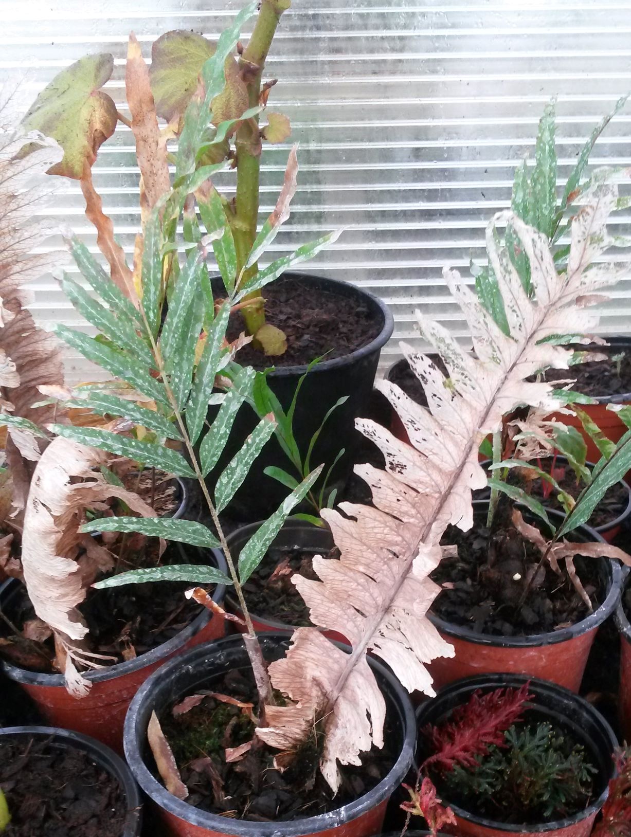 Nous sommes très heureux de vous proposer cette magnifique fougère épiphyte. Elle possède deux types de frondes : de longues frondes vertes, pennées, et de courtes frondes marron, profondément lobées, à la base de la plante. Dans la nature, les frondes vertes perdent leurs folioles pendant la saison sèche, et ne restent que les rachis (nervures centrales), en plus des frondes basales marron. Elle est cultivée juste hors gel ici, en stoppant les arrosages en hiver. Devrait tenir en bord de mer, elle forme un très originale plante d’intérieur ou de véranda.