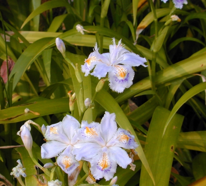 L’iris du Japon est un iris stolonifère, d’ombre et de mi-ombre. Les feuilles vert intense et brillantes sont disposées en éventails inclinés à 30 / 45° au ras du sol. Les fleurs sont blanches ou lavande pâle, avec des taches bleues et orange. Elles apparaissent au printemps en grappes lâches, et évoquent la finesse des orchidées! C’est une plante très élégante en massif et sur des murs végétaux, où le feuillage devient alors retombant, et donne une matière unique, très utilisée par Patrick Blanc sur ses murs. Culture facile en sol frais, à mi-ombre. Pour comparer les fleurs des différents Iris que nous vous proposons, cliquez ici.