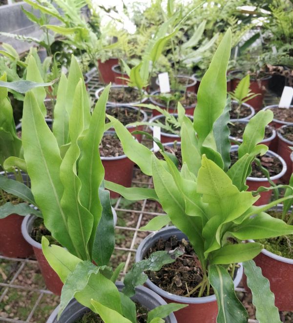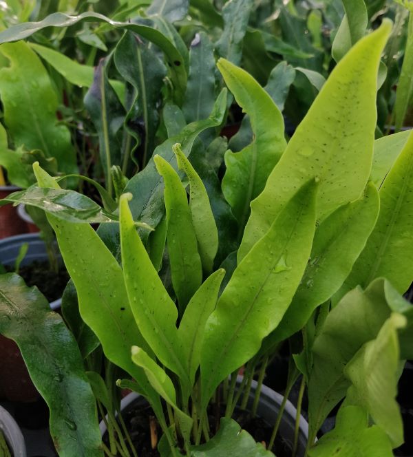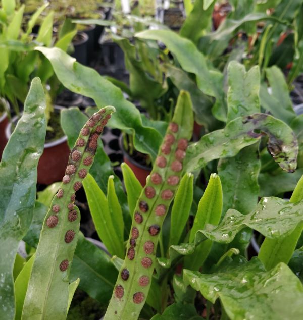 Les frondes de Lepisorus megasorus, entières et coriaces, sont dressées et forment une touffe dense d’une trentaine de cm de haut. Gros sores jaune orangé très visibles au dos des frondes en automne. Croissance lente, mais plante solide.