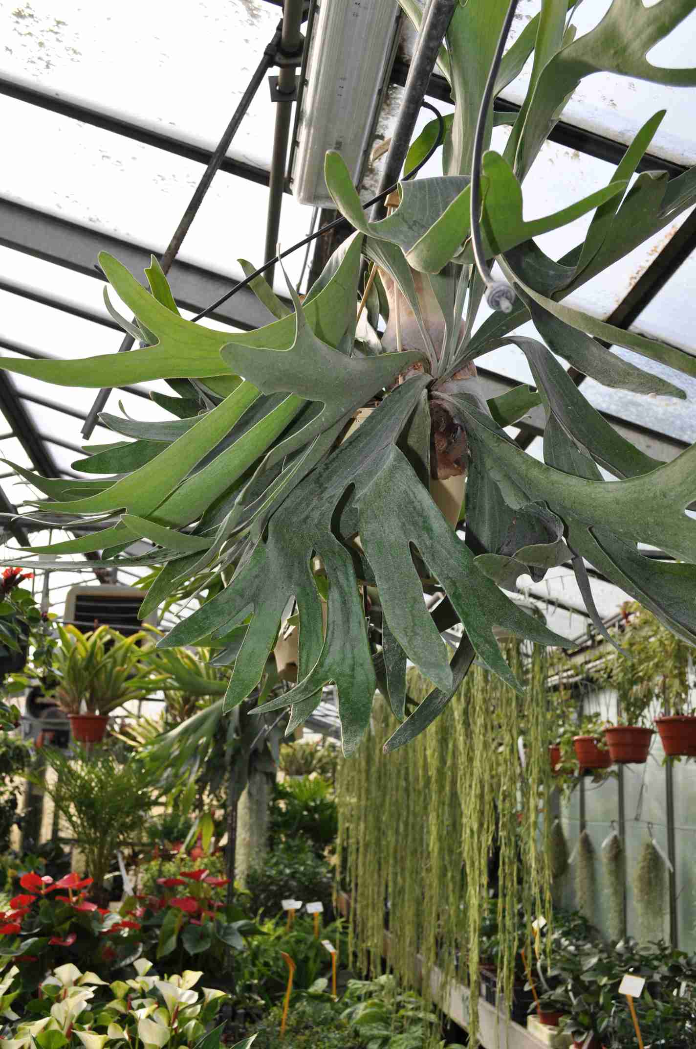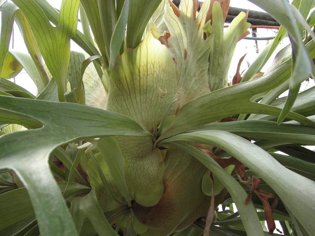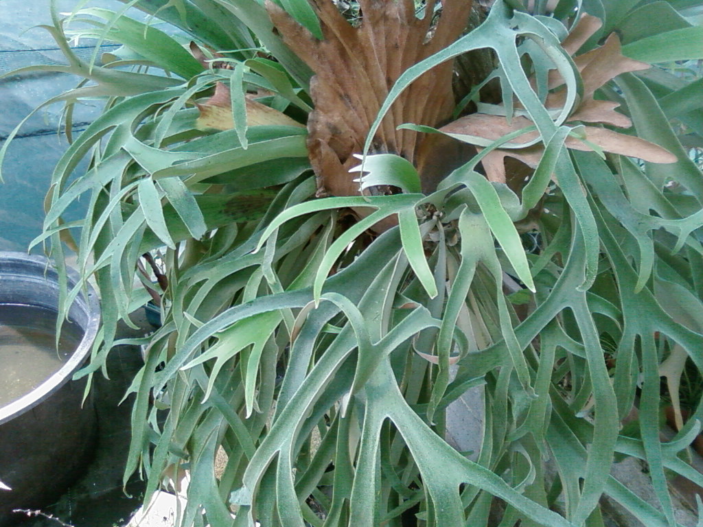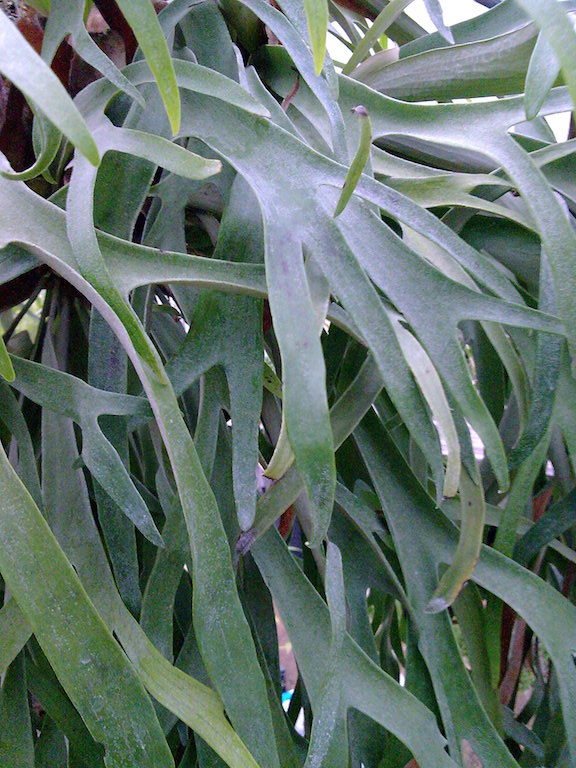 La fougère corne de cerf est une plante épiphyte (non parasite) qui, adulte, atteint environ 2 m de diamètre. C’est la taille qu’a notre pied, que nous cultivons depuis 20 ans! En intérieur, elle gardera des proportions plus contenues (quoique!) Cette espèce australienne émet de nombreux bourgeons latéraux, qui lui permettent de s’accroître en tous sens. Arroser bien, une fois par semaine, pas plus. Ralentir les arrosages en hiver, et protéger des gels.