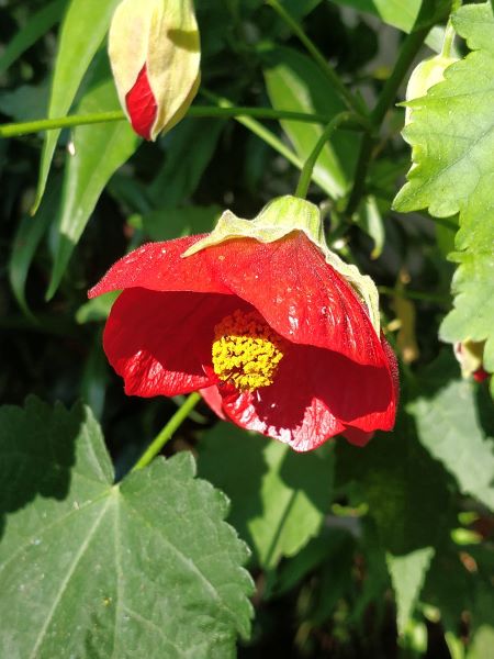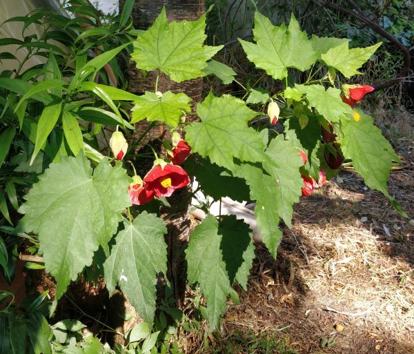 Abutilon ‘Nabob’ est un buisson à feuilles d’érable et à fleurs rouge foncé brillantes de toute beauté! Les clochettes apparaissent pendant tout l’été, à mi-ombre. Sol riche et drainant.