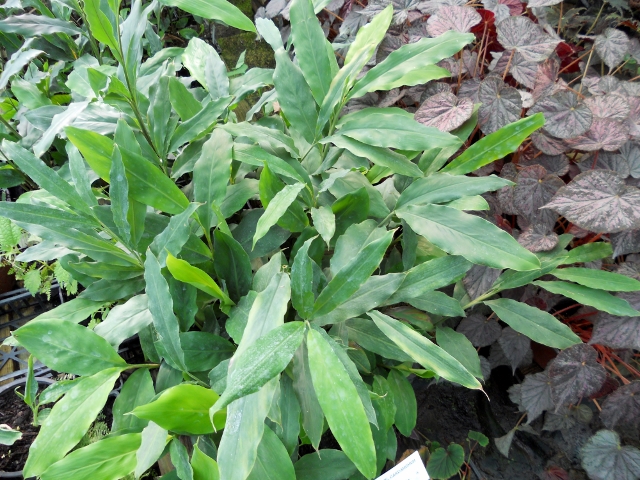 La Méliguette, ou fausse Cardamome. C’est une cousine du gingembre, dont elle a le même port, avec des feuilles plus larges. L’odeur que dégage la plante est tout à fait caractéristique. Doit être gardée en serre pour fleurir, mais résiste bien ici en extérieur, sans fleurir, à des T° de -3°C (avec dégel quotidien). C’est aussi une très bonne plante d’intérieur, parfumée et résistante.