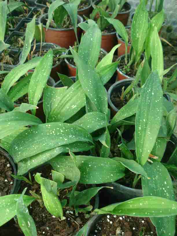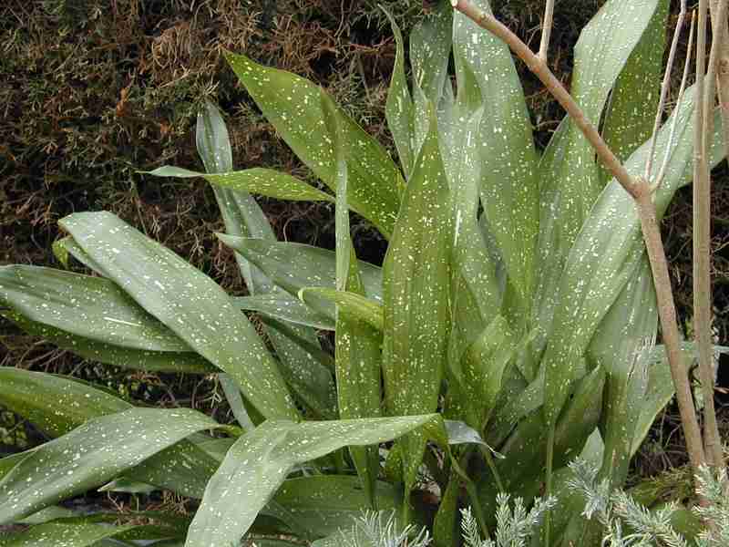 Les feuilles sont plus fines et moins hautes que A. elatior, et elles sont constellées de taches blanches. La plante a un aspect plus touffu, et fleurit régulièrement au ras du sol. Peu d’entretien, plante très vigoureuse. Supporte très bien la sécheresse saisonnière. Excellente plante d’intérieur.