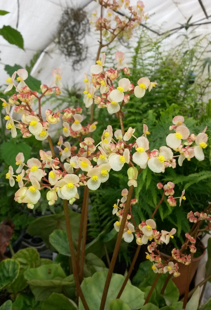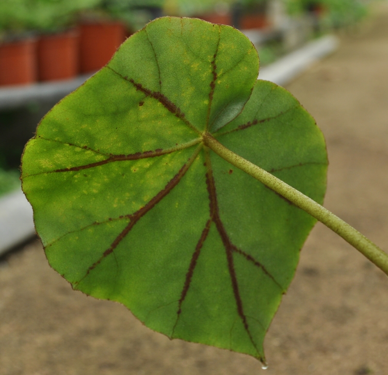 ‘= Begonia hidalgensisBegonia nigroveniaBegonia dayi. Ce Begonia rhizomateux forme une touffe dense de feuilles charnues vert foncé, ourlées, avec nervures principales noires. Les inflorescences automnales et hivernales passent au dessus du feuillage, et sont d’une curieuse couleurs jaune orangé. Ce très original Begonia est de culture facile, et ne demande pas beaucoup d’entretien… et surtout pas trop d’eau!