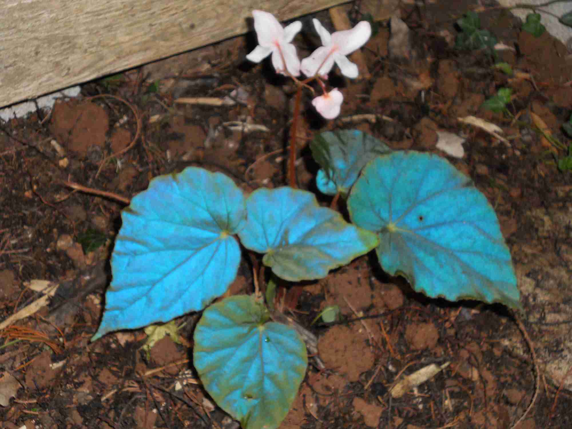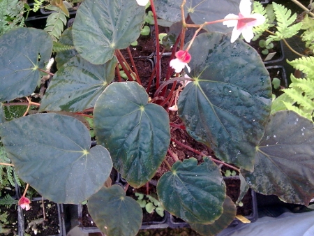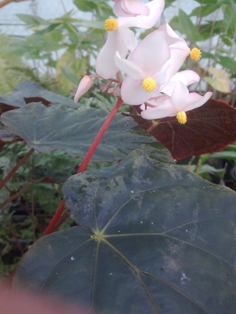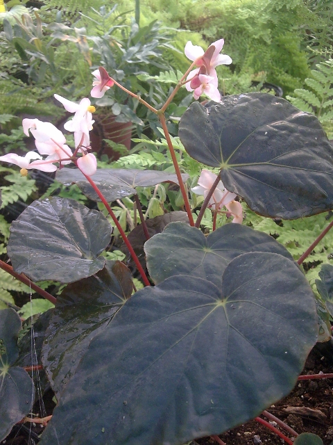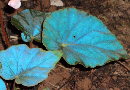 Begonia pavonina forme une touffe de feuilles asymétriques pointues. Originaire des sous bois malaisien de moyenne altitude (Cameron Highlands), il est habitué à une faible lumière, une humidité régulièrement élevée, et des températures stables, il possède – et c’est un des seuls à ce point – des feuilles irisées, totalement bleues lorsque la lumière incidente est parallèle à votre regard! Assurément la pièce centrale d’une collection de bégonias. La forme que nous cultivons est celle à revers de feuilles rouges. Les fleurs roses apparaissent plutôt en été. Culture facile en atmosphère humide en permanence (terrarium).