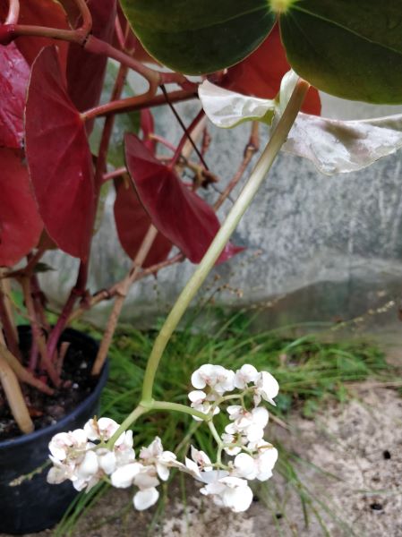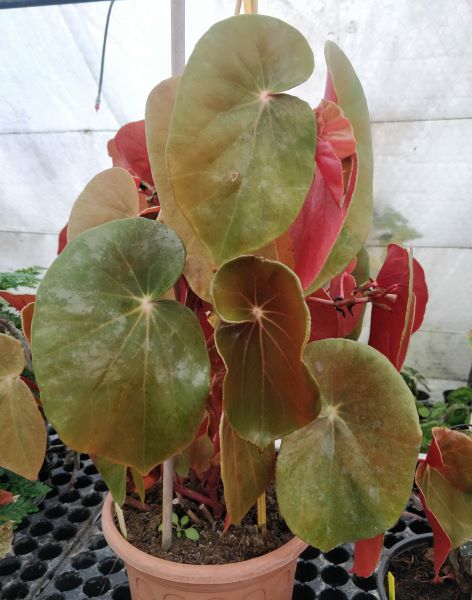 Begonia sanguinea est remarquable par ses feuilles épaisses à revers rouge sombre, qui lui ont valu son nom d’espèce. Floraison blanche estivale. De type buissonnant, cette espèce brésilienne forme une touffe à plusieurs branches. Garder à l’intérieur. Pas trop d’arrosage.