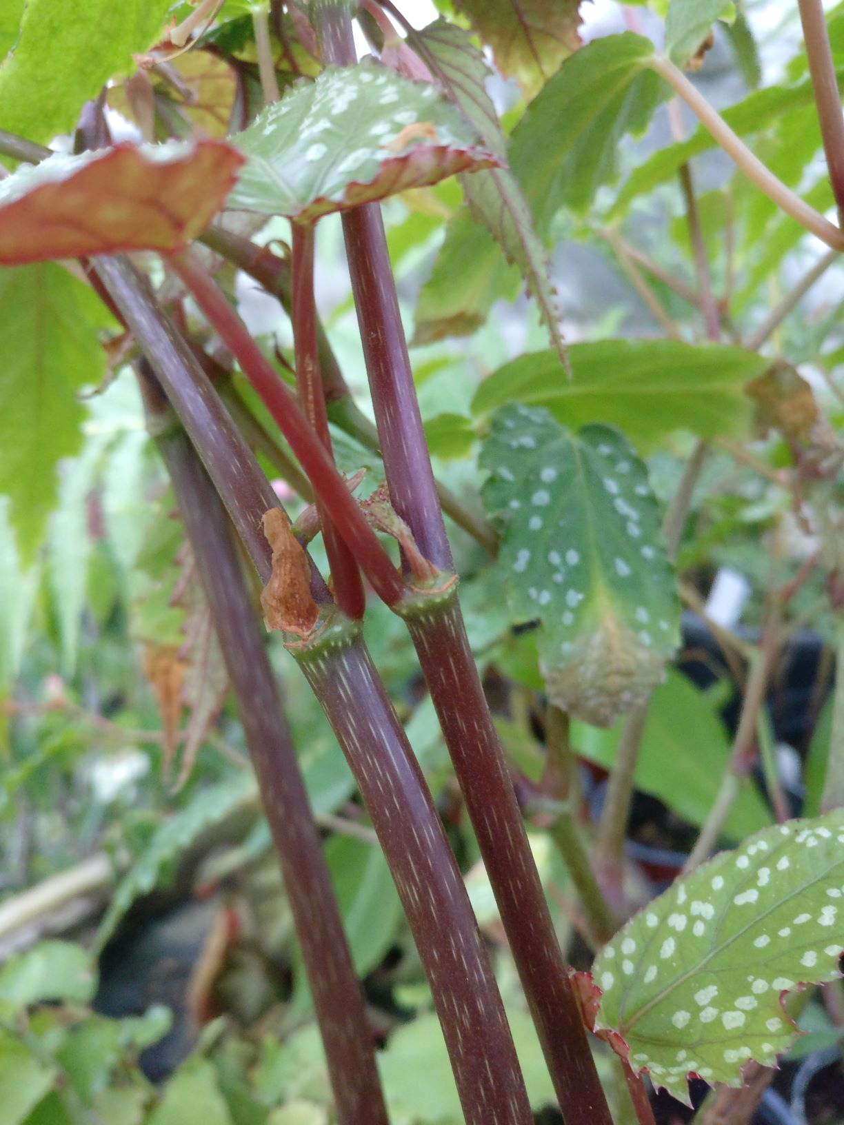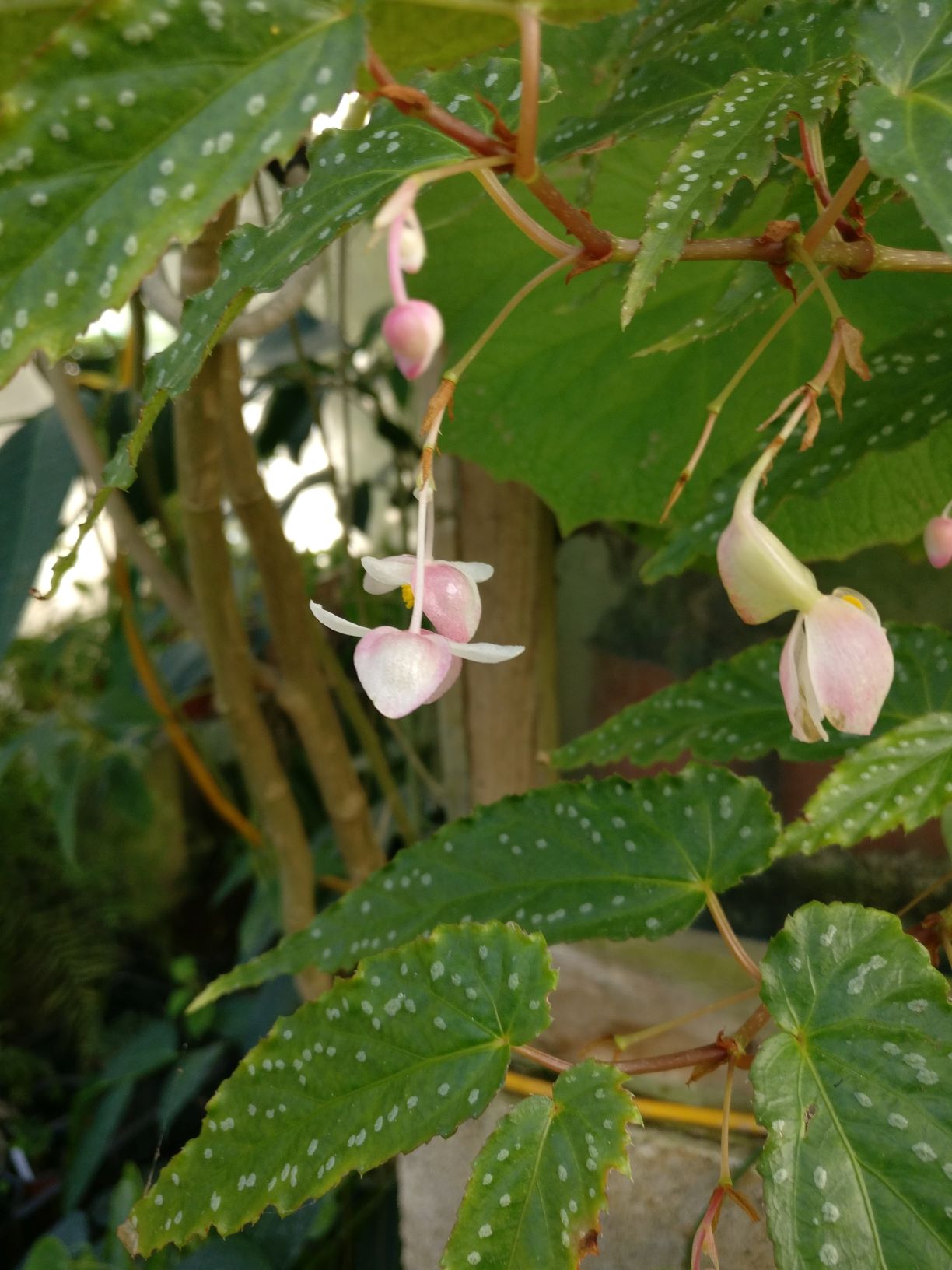 Cette espèce native de Taïwan est un bégonia bambusiforme (bégonia aile d’ange) de petite taille, jusqu’à 80 cm ici. Ses feuilles sont étroites, dentées, jusqu’à 10 cm de long ici, et sont mouchetées de blanc, avec le revers rouge.