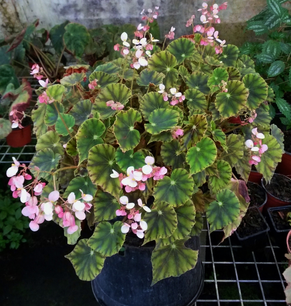 Ce Begonia rhizomateux a des feuilles de 5 à 7 cm de long, ovales, et un port compact en touffe.