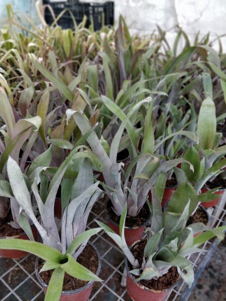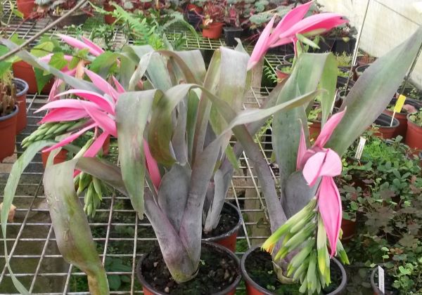Billbergia distachya var. straussiana (= Billbergia distachia var. straussiana) forme une touffe dense de larges feuilles dressées. La variété straussiana a les bases des feuilles saupoudrées d’un ‘velours’ violet argenté. Les fleurs apparaissent au printemps, portées par des branches retombantes très élégantes. Les bractées rouge sont plus grandes que chez Billbergia nutans. Culture facile en intérieur lumineux sans soleil, ou en extérieur en climat doux. Garder au sec en hiver si froid.