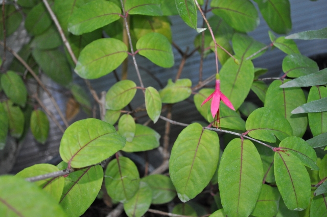 Ce Fuchsia alpestris est grimpant et a des feuilles larges comparé aux autres espèces. Rustique à Paris, où il repart de souche au printemps. Les feuilles rougissent en automne. Les fleurs sont effilées rouge, comme F. regia. Excellente plante à utiliser comme grimpant dans un arbre, à palisser contre un mur, ou bien sur un mur végétal.