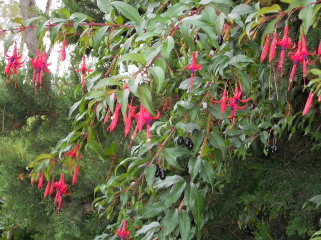 Ce fuchsia est grimpant naturellement. Il émet de longues branches qui se “coincent” dans la végétation, un peu à la manière de la dentelaire du Cap. La souche que nous vous proposons est sélectionnée pour sa résistance au froid (-10/-15°C). Les fleurs rouges sont pendantes suivies de prunes rouge-violacé pendant l’hiver. Très vigoureux.