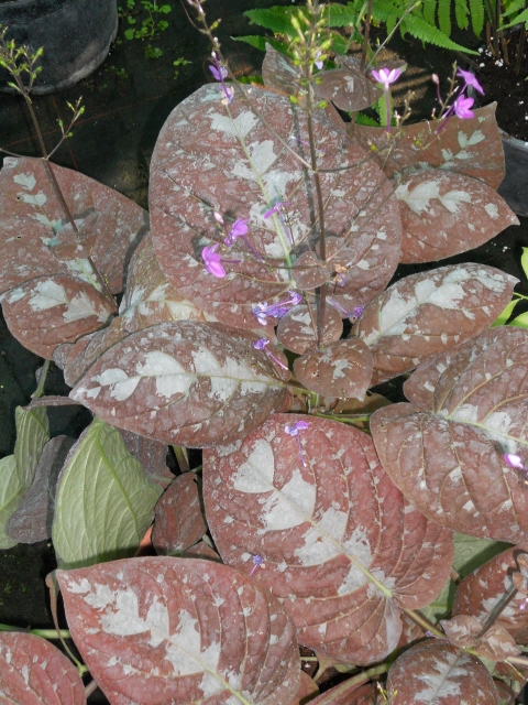 La “plante chocolat” nous vient du Mexique, et surprend assurément lorsqu’on la découvre! Cette cousine des acanthes méditerranéennes forme de basses touffes de larges feuilles ovales, et totalement marron! Des macules argentées marbrent la nervure médiane. Les fleurs violettes, petites, sont organisées en épis terminaux. Plante facile à cultiver en intérieur, à l’ombre, serre ou véranda. Craint le gel.