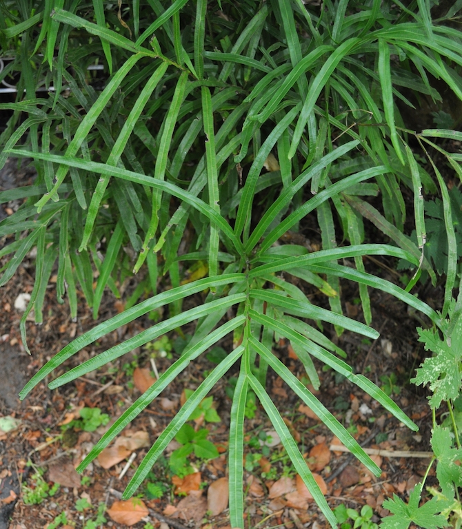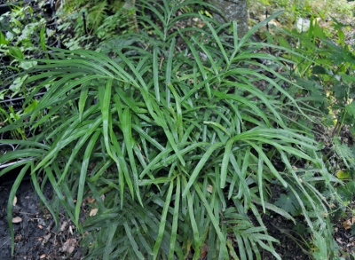 Cette fougère a un port et un découpage de feuilles très élégants évoquant un mini bambou. C’est une fougère touffe qui se ressème si l’humidité du lieu est régulière. Elle tient ici dehors depuis 15 ans, sans autre protection qu’un chêne blanc, en sol argilo-calcaire. Pteris cretica peut être cultivée en intérieur (éviter l’air trop sec) et sur mur végétal, où son port souple fait merveille.