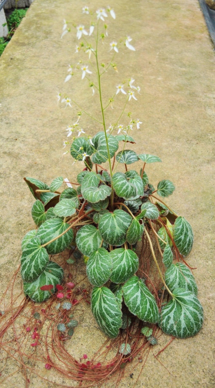 Rosette de feuilles rondes charnues vert à nervures gris argenté. Floraison blanche printanière au bout de longues hampes dressées. Cette excellente plante de rocaille fait merveille aussi en suspension, grâce à ses stolons portant des rosettes de feuilles au bout. Sol normal. Ombre à mi-ombre. Peut être utilisé en intérieur. La souche que nous multiplions est celle de mon jardin en Bourgogne, qui a supporté -30°C en 1986.